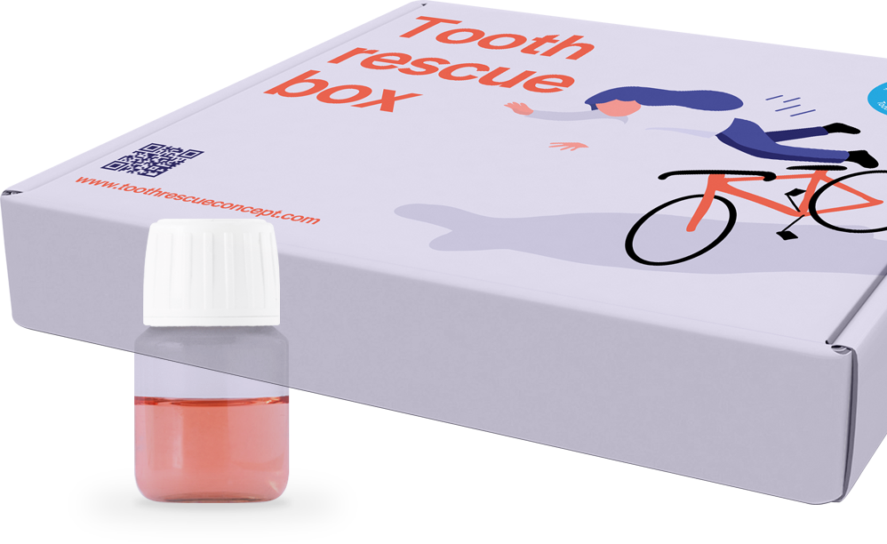 When a tooth is knocked out, it is essential to preserve the sensitive cells of the root surface. Incorrect storage causes these important cells to die off quickly. The tooth rescue box (small vial) contains a special cell nutrient solution which keeps the cells vital for up to 48 hours.